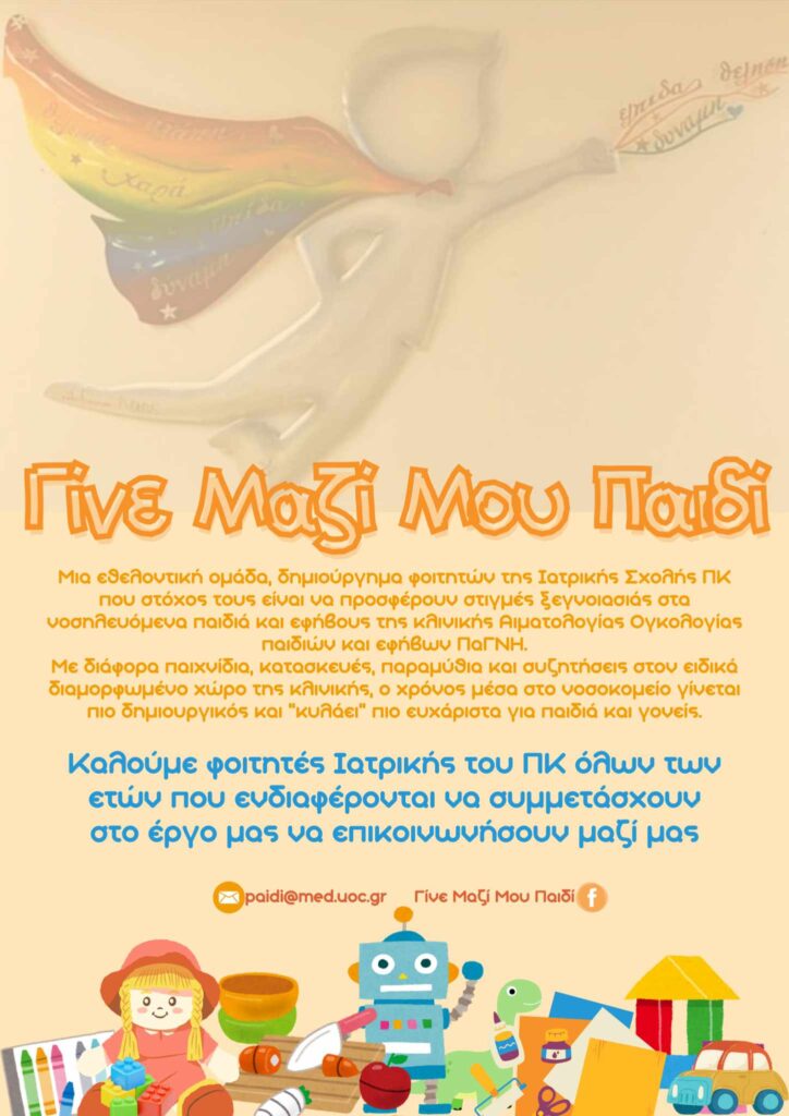“Γίνε Μαζί Μου Παιδί”, μια εθελοντική ομάδα που άρχισε τη δράση της πριν από 12 χρόνια, περίπου, με πρωτοβουλία κάποιων φοιτητών Ιατρικής σε συνεργασία με τη διευθύντρια της κλινικής, κα Στειακάκη.
