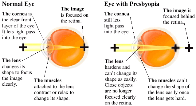 Η πρεσβυωπία εμφανίζεται στην ηλικία των 40 ετών και βασικό της σύμπτωμα είναι η μειωμένη κοντινή όραση. Υπάρχει δυσκολία στο διάβασμα χωρίς γυαλιά σε απόσταση 35 – 40 εκατοστών και κόπωση μετά από σύντομο διάστημα κοντινής εργασίας. Φυσιολογικά, κατά την όραση κοντινών αντικειμένων για να εστιάσει η εικόνα πάνω στον αμφιβληστροειδή ο κρυσταλλοειδής φακός αλλάζει σχήμα. Ο λόγος της εμφάνισης της πρεσβυωπίας είναι η απώλεια της ευκαμψίας και της ελαστικότητας αυτού του φακού. Τα τελευταία χρόνια η ανάπτυξη αποτελεσματικής και μόνιμης χειρουργικής θεραπείας για την πρεσβυωπία αποτελεί πεδίο εντατικής έρευνας, στην οποία το ΒΕΜΜΟ πρωτοστατεί.