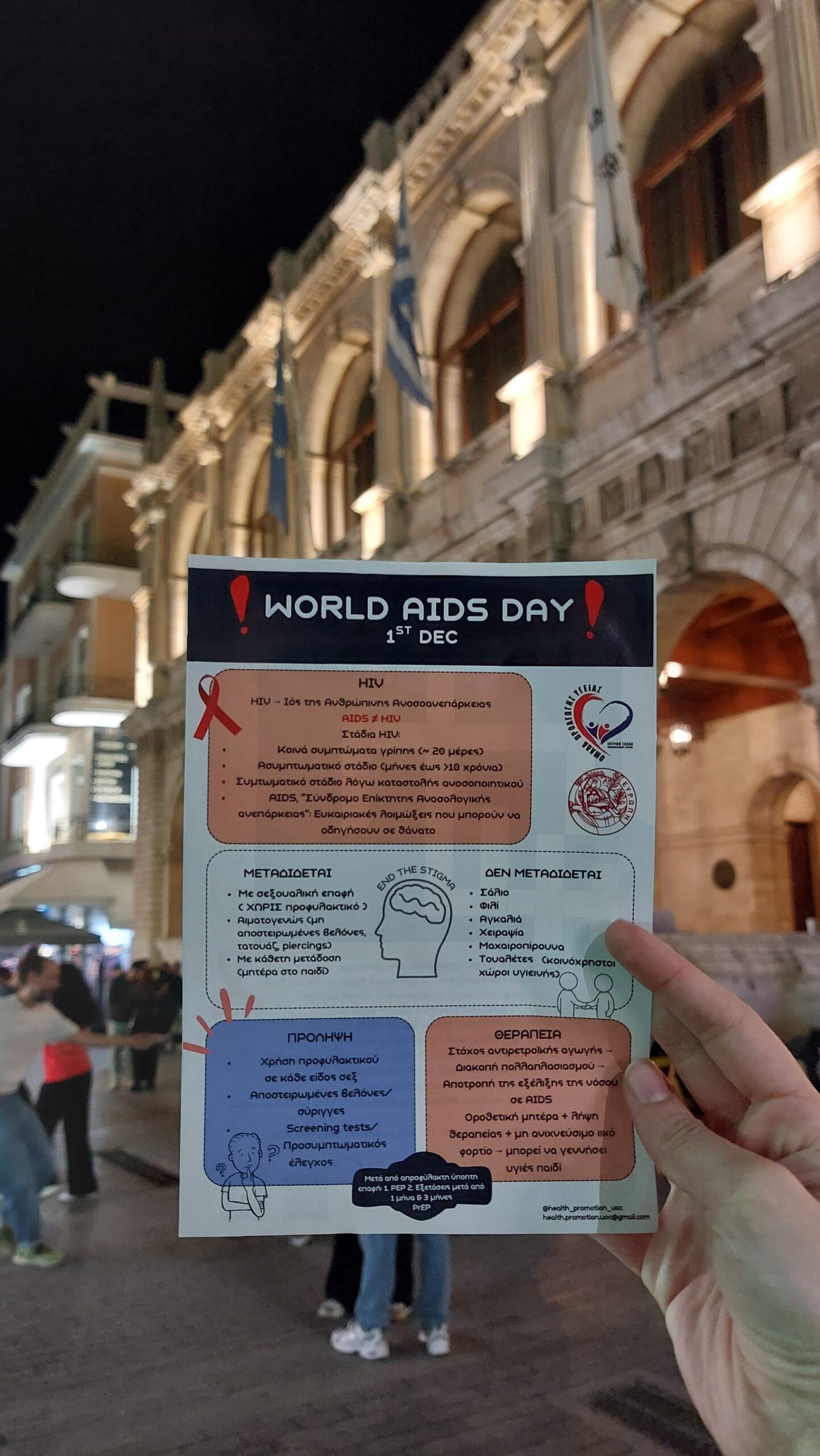Η Εθελοντική Ομάδα Προαγωγής Υγείας, σε συνεργασία με τη HelMSIC, συμμετείχε σε μια “street action” με αφορμή τη World AIDS Day, ενημερώνοντας τον γενικό πληθυσμό για το AIDS και τον HIV. Μέσα από φυλλάδια, παιχνίδια και άλλους επικοινωνιακούς τρόπους, καταφέραμε να προσεγγίσουμε το ευρύτερο κοινό και η δράση μας είχε σημαντική ανταπόκριση και επιτυχία!